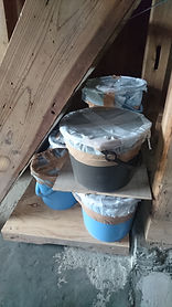 赤土・白土細目の削りカス粘土を入れる樽を乗せる台車を作りました。樽は粘土で満タンになると相当な重さになります。通常は作業台の下に置いていますが、土練機で練り直す時など楽に機械の近くに移動できます。